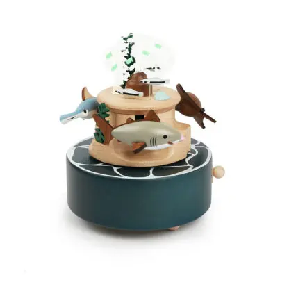 Le mécanisme à remonter est très précis. Un petit interrupteur en bois permet d’actionner ou d’arrêter la musique et le mouvement.