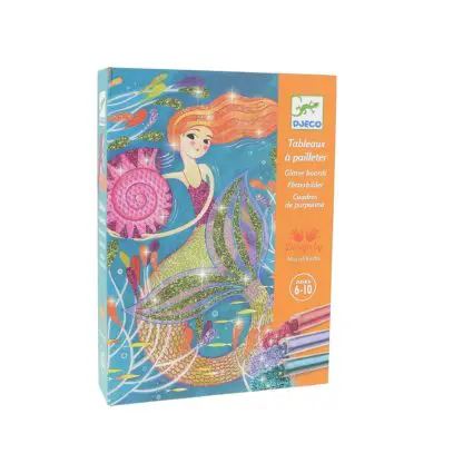 Tout est réuni dans cette boîte d’activité pour éveiller l’âme d’artiste des enfants. 4 tableaux aux surfaces encollées et numérotées attendent d’être pailletés. Pas à pas, les sirènes se colorent et brillent sous l’effet des paillettes, pour un résultat féérique.