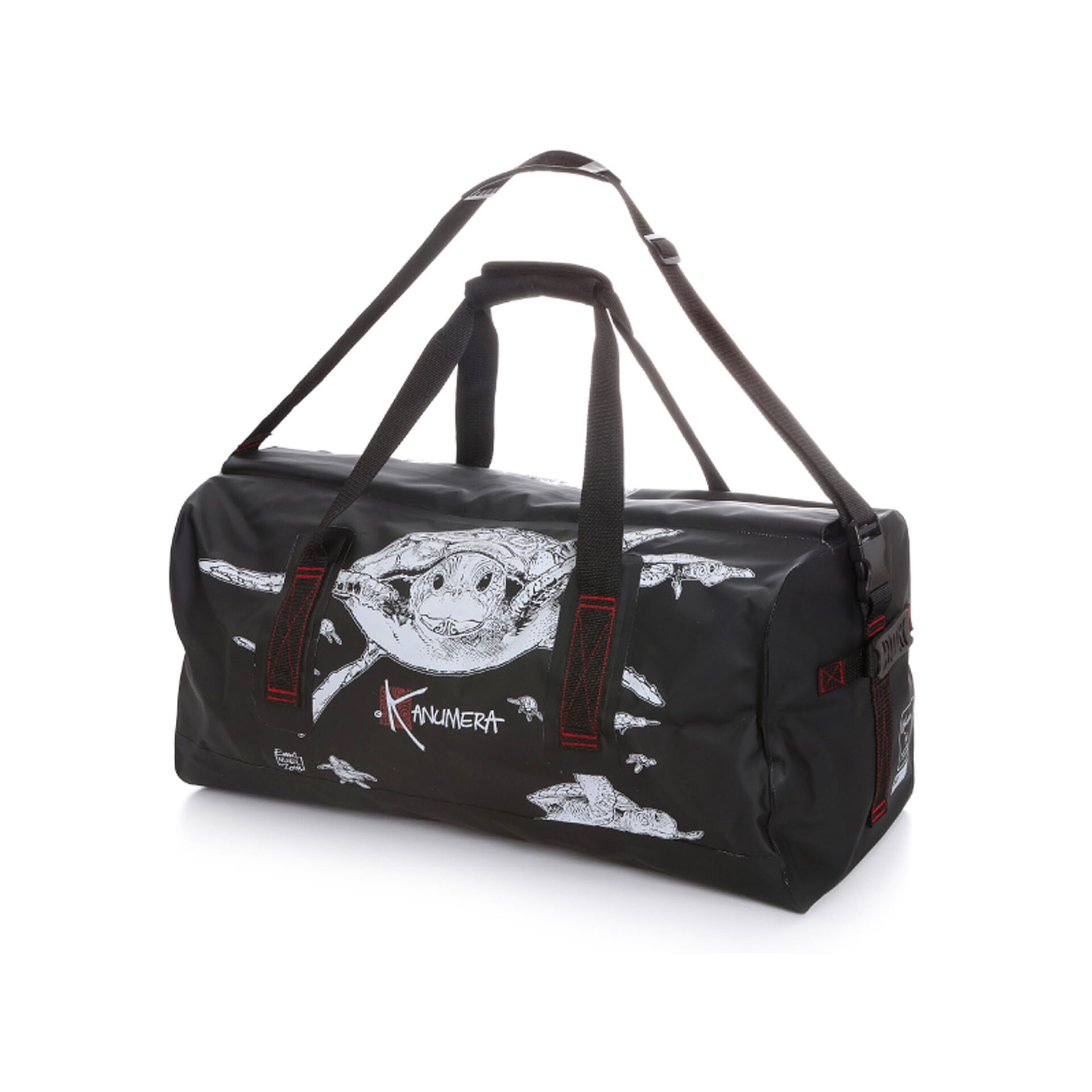 Un sac à bandoulière étanche de 65L au tatoo tortues pour partir à l’aventure.