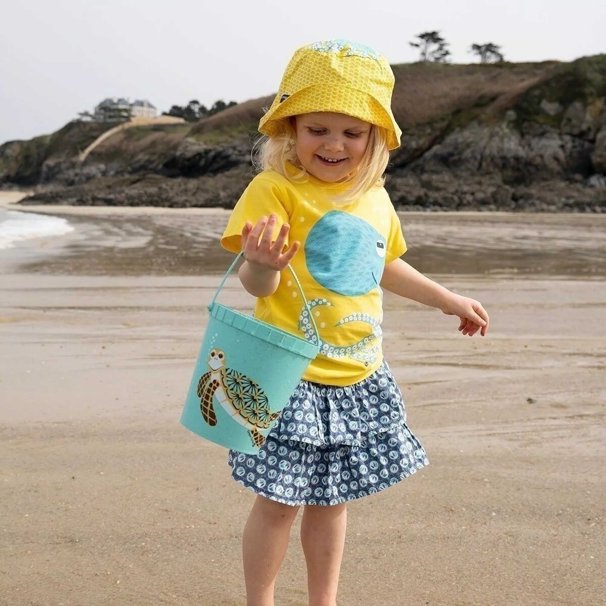 A l’effigie de la tortue, il se compose d’un seau à anse, un tamis, une pelle et un râteau.
